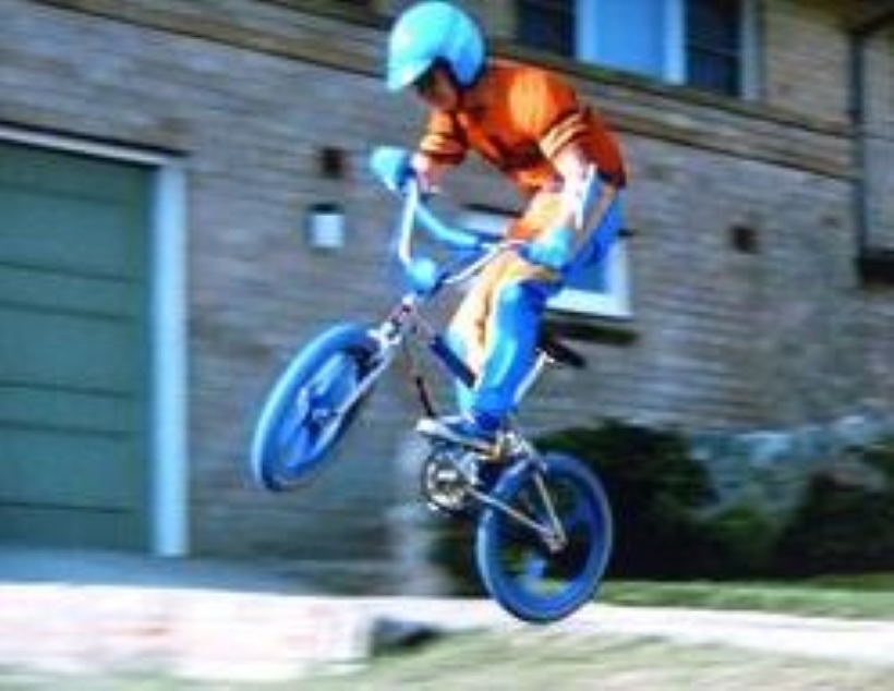 Robbie wearing the blue helmet bunny hops his bike in one of the scenes.