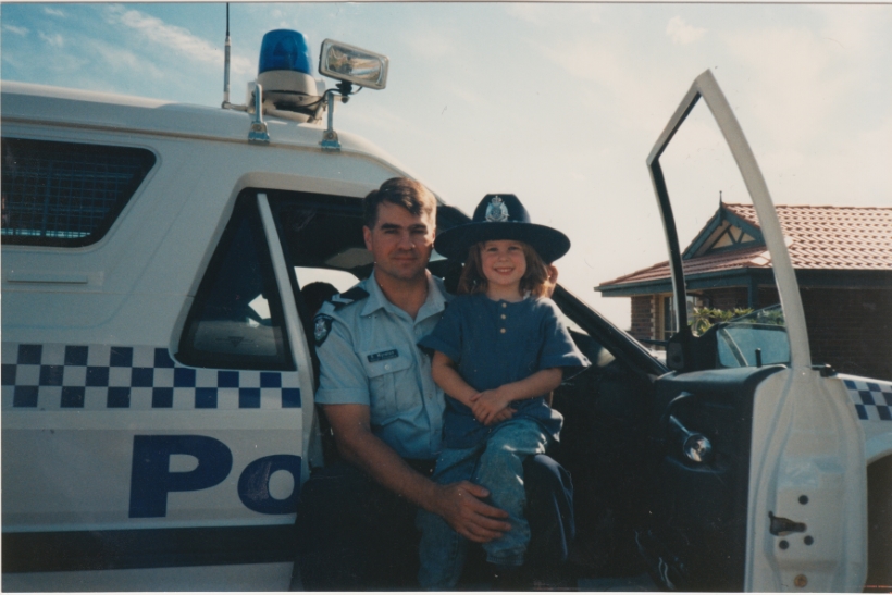 Robbie with young Carly sitting on his knee in a police divisional van.  Photograph taken circa 1995.